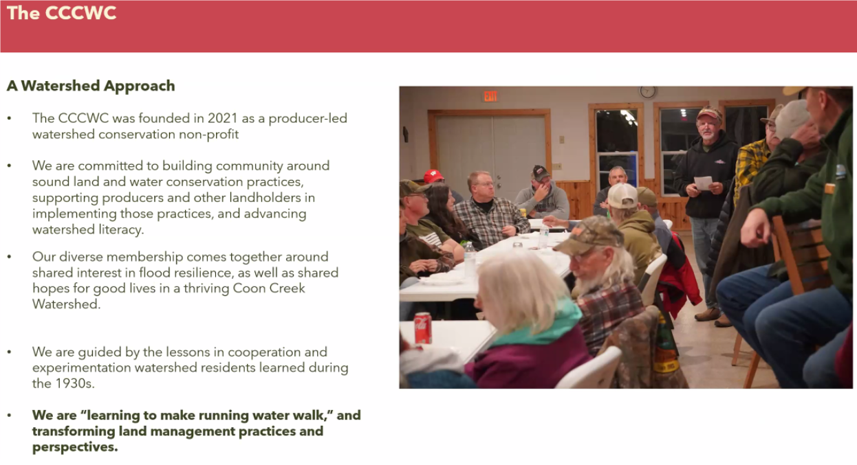 Next month Sydney Widell will present on the Coon Creek Community Watershed as our guest presenter. Coon Creek watershed suffered major damage during a serious storm a few years ago. The community has rallied to prevent this type of damage happening in the future.